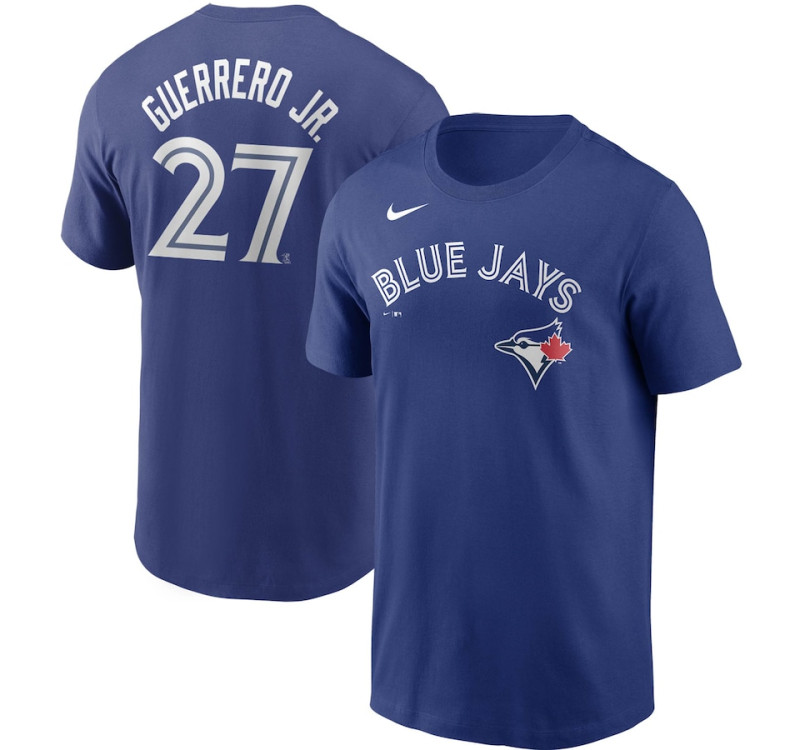 Before Vladimir Guerrero Jr. steps on the field for the next Toronto Blue Jays game, gear up in this Name and Number T-shirt from Nike. Its lightweight cotton fabric is breathable and comfortable, perfect for the midsummer heat of baseball season. The back features printed graphics that highlight your admiration for Vladimir Guerrero Jr..
