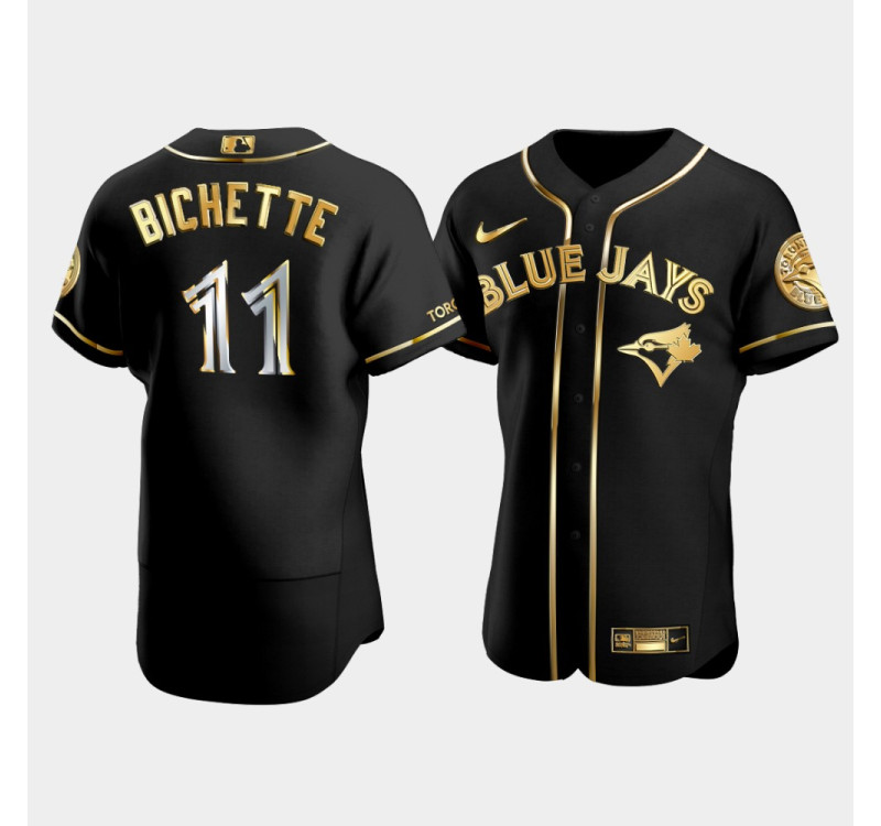 Men's Toronto Blue Jays Bo Bichette #11 Black Gold Edition Authentic Jersey Men's Toronto Blue Jays Bo Bichette #11 Black Gold Edition Authentic Jersey. Highly breathable fabric helps keep sweat off your skin, so you stay cool whether you're cheering in the stands or playing on the pitch.Your die-hard Toronto Blue Jays dedication cannot be beat! Let everyone know your pride is Matt Chapman by sporting your own customized look for game day with this Toronto Blue Jays Replica Jersey.
