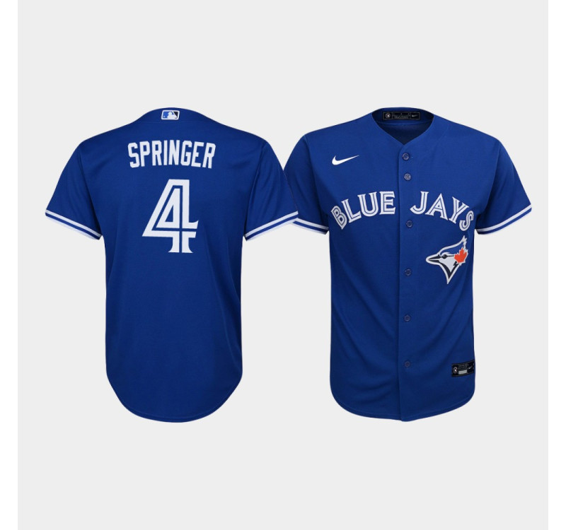 Youth Toronto Blue Jays George Springer #4 Royal Replica Alternate Jersey Youth Toronto Blue Jays George Springer #4 Royal Replica Alternate Jersey. Highly breathable fabric helps keep sweat off your skin, so you stay cool whether you're cheering in the stands or playing on the pitch.Your die-hard Toronto Blue Jays dedication cannot be beat! Let everyone know your pride is Matt Chapman by sporting your own customized look for game day with this Toronto Blue Jays Replica Jersey.